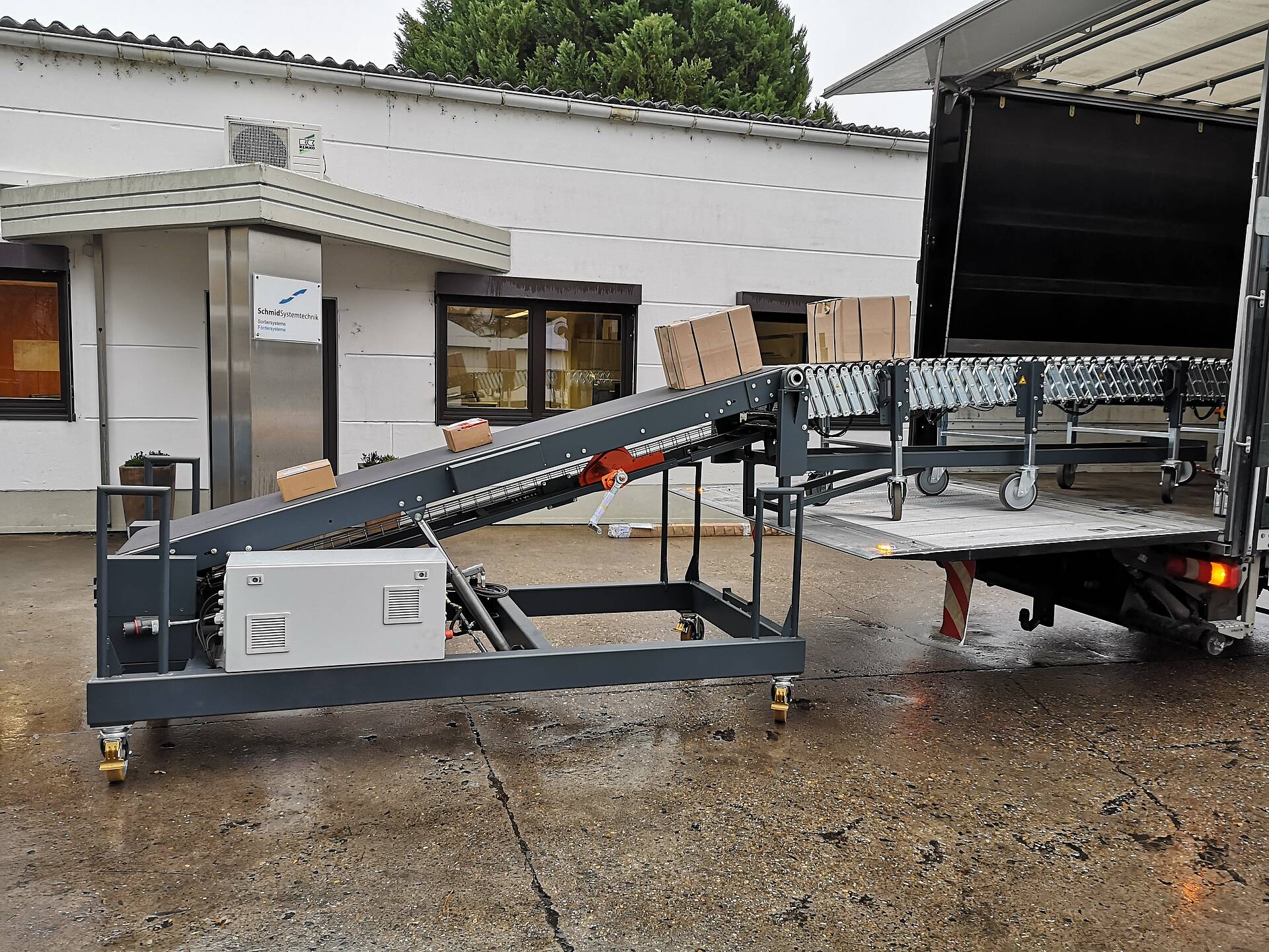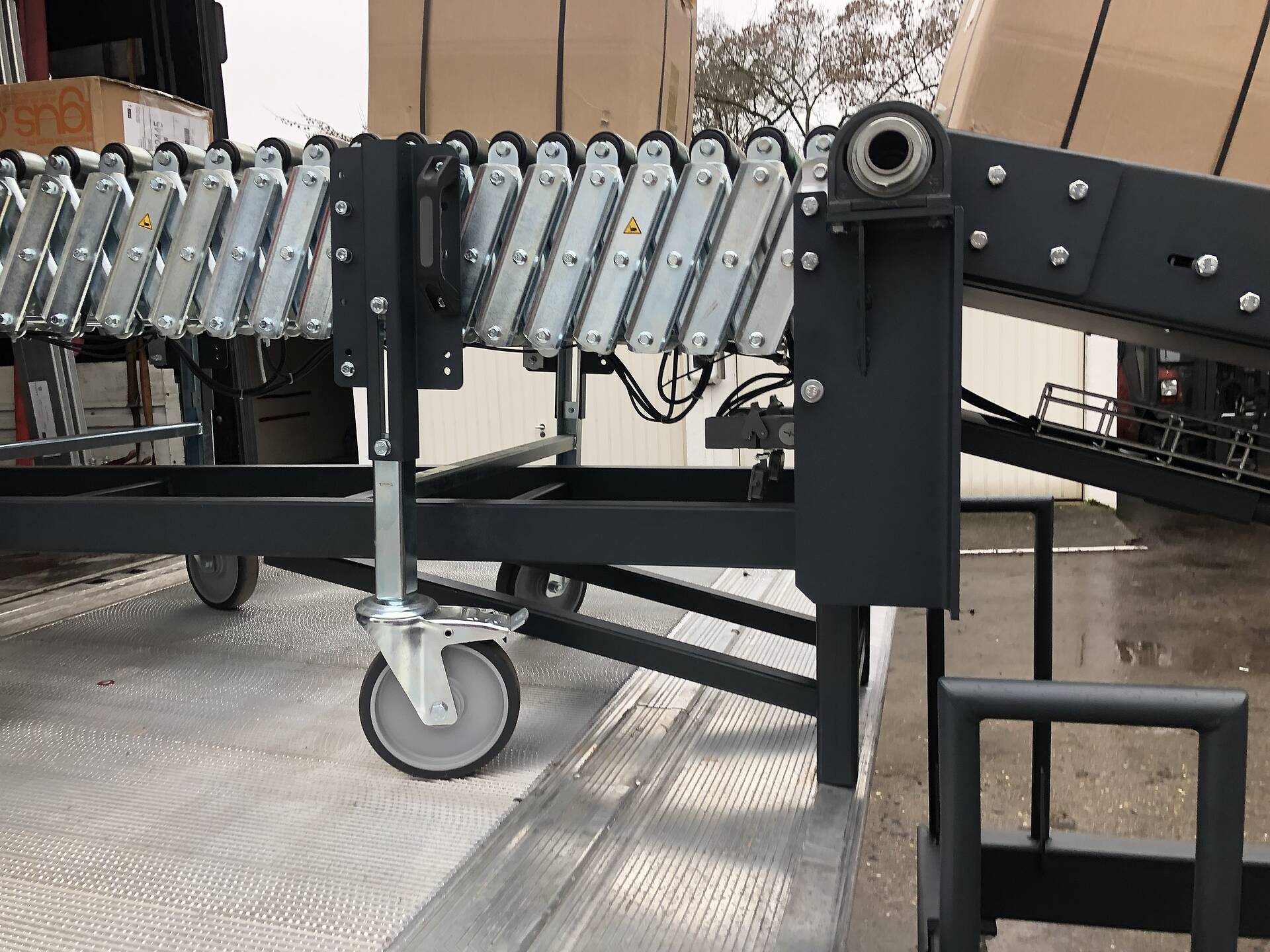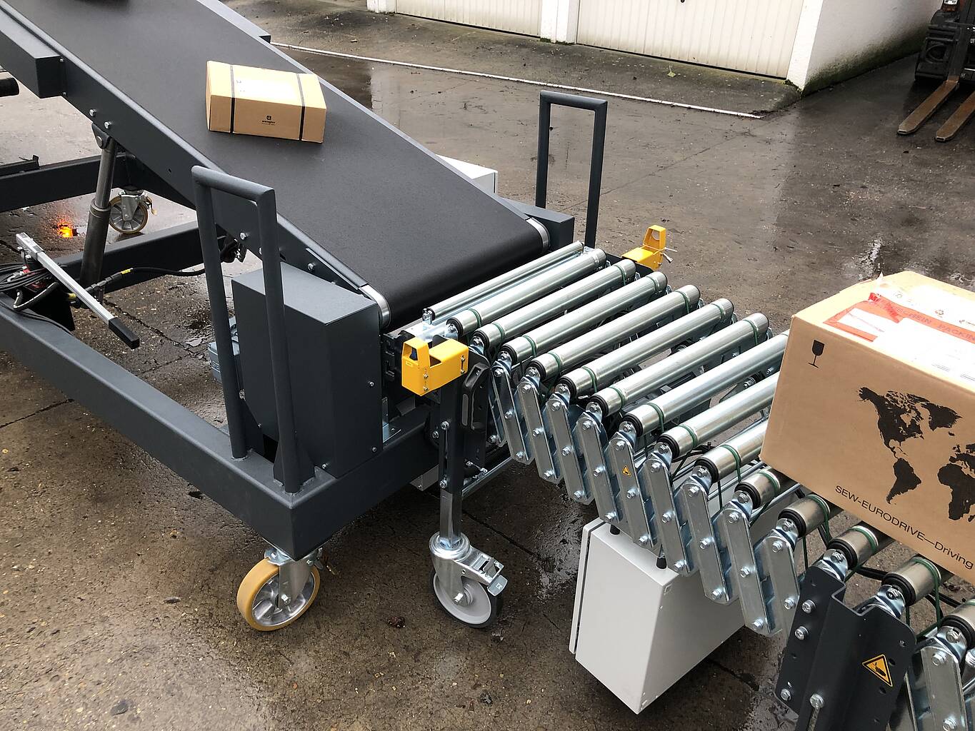 The belt conveyor can be hydraulically adjusted to the height of the truck or swap body. The powered expandable roller conveyor is extended to the appropriate loading or unloading position.